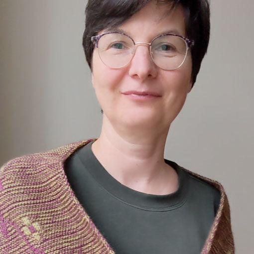 Galina focuses primarily on knit accessories worked in garter stitch with a twist. She enjoys various techniques like short-row shaping, double knitting, intarsia and especially beaded knitting, a passion she discovered in 2017.