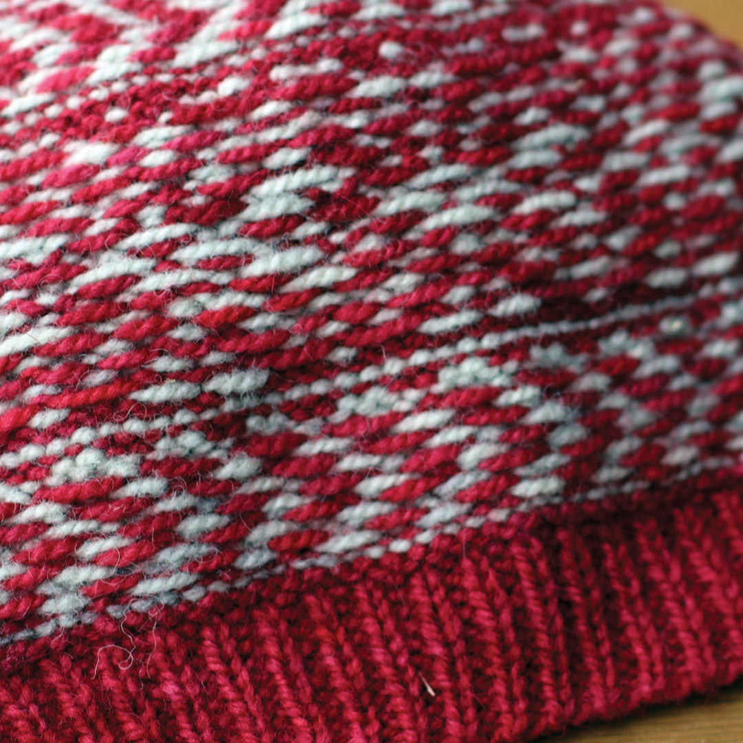 Sample shown in Sweet Paprika Winfield (100% Canadian wool; 110g /4 oz; approx 224m/245 yds), 1 skein each in Orchid (MC) and Shiitake (CC).