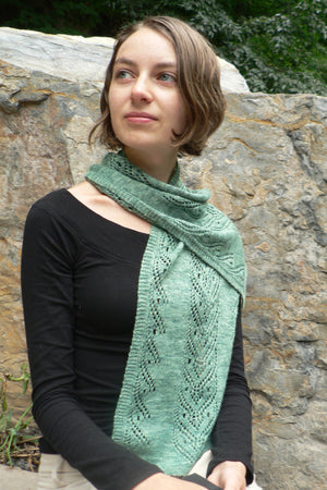 Windermere puts a twist on the popular Tiger's Eye lace pattern to create an elegant knitted scarf with an edging that mirrors the centre panel. The lace pattern is given in both written and chart format.